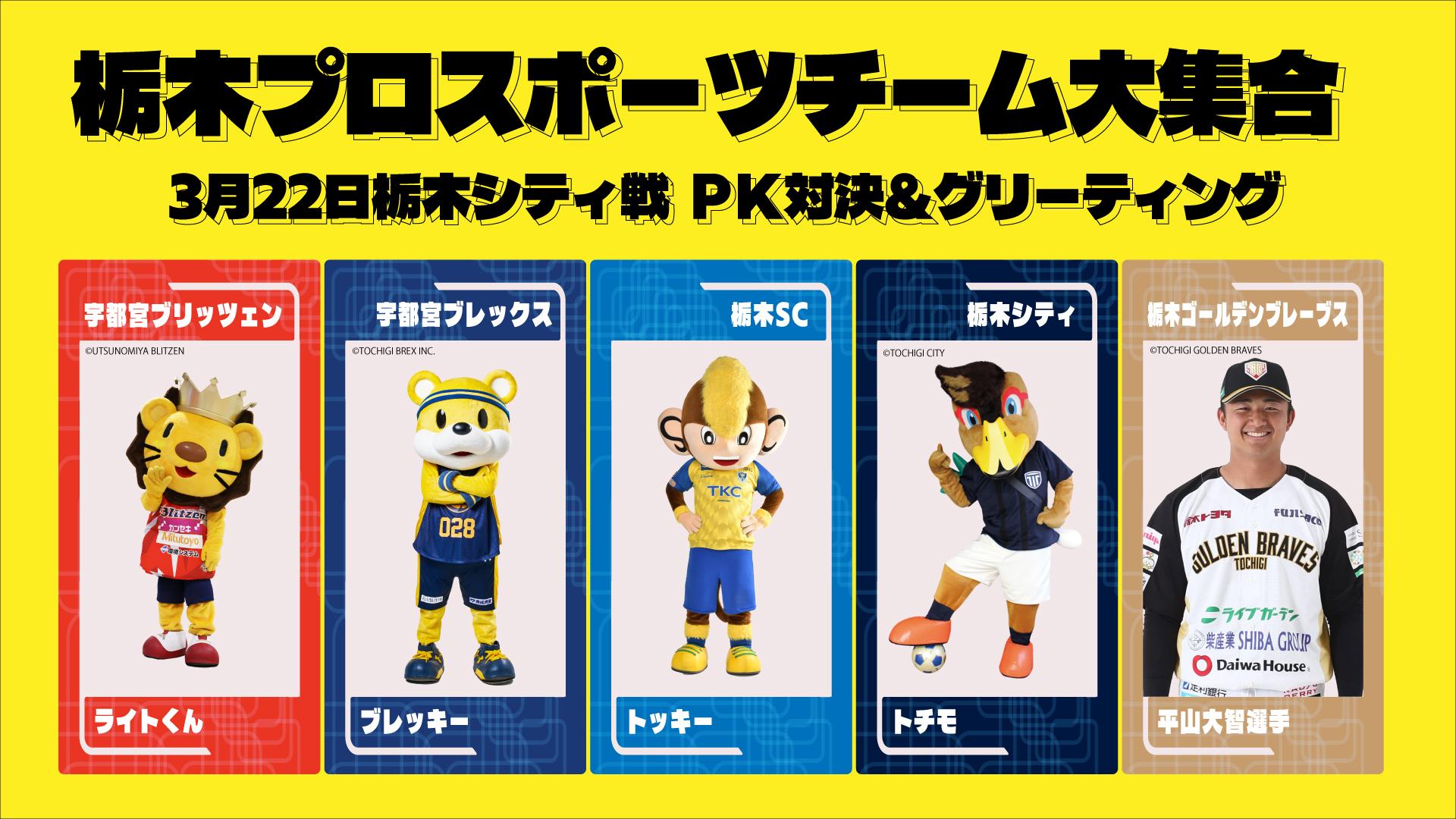 栃木県内のプロスポーツチームが集まり、PK対決やグリーティング等を実施いたします。 「栃木ダービー」を盛り上げるためカンセキスタジアムとちぎへ集まっていただいた各マスコット・選手によるイベントをぜひお楽しみください!