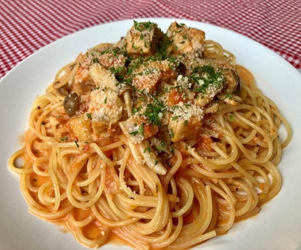 本日の限定パスタは、若鶏もも肉と旬のしめじ、エリンギ、えのきを自家製トマトソースと生クリームで仕上げました!