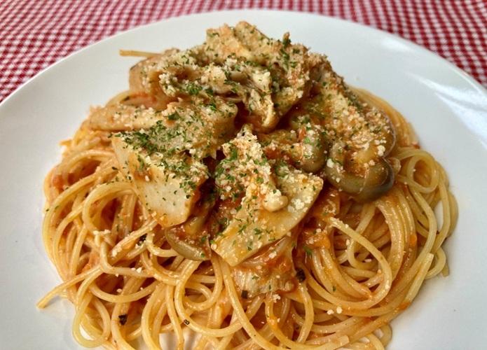 里芋、豚肉、しめじ、エリンギ、えのきを自家製トマトソースと生クリームで!仕上げに粉チーズを!
