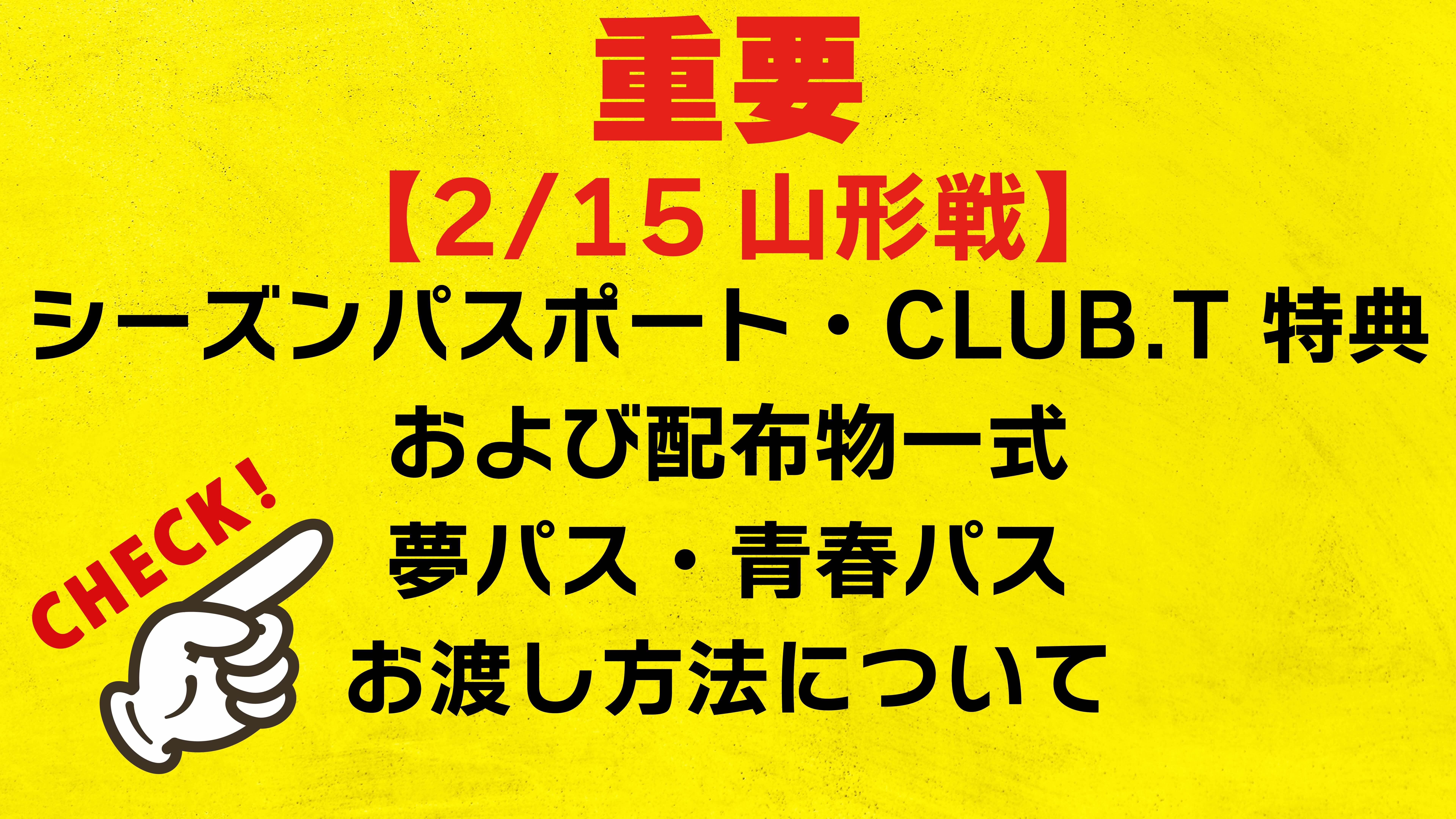 2月8日(日)ヴァンラーレ八戸戦(開幕戦)で予定しておりました、シーズンパスポート・CLUB.T会員様のワンタッチパス・会員情報シール・特典等の配布物一式、夢パス・青春パスのお渡し方法について、2月8日八戸戦に引き続き、2月15日(日)モンテディオ山形戦においても下記の通り実施させていただきます。