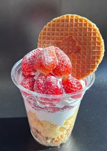 トッキー君のロゴワッフルをのせた、栃木県産のいちごたっぷりのカップパフェ。